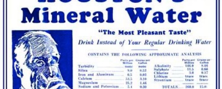 W.A. believed the voice had delivered on a promise. He would go on to establish the business that is still in operation today. We do not know what, if any, benefit Houston’s Mineral Water has for people who suffer from kidney disorders, or for that matter, any health issues. However, from our testing, we do know that Houston’s Mineral Water contains a number of beneficial minerals (calcium, magnesium, silica, zinc, iron, potassium), despite its “pleasant” taste. (W.A.’s original slogan: “The Most Pleasant Taste.”) The water also contains natural fluoride. Bill, who has drunk it his entire life, has never had a cavity.